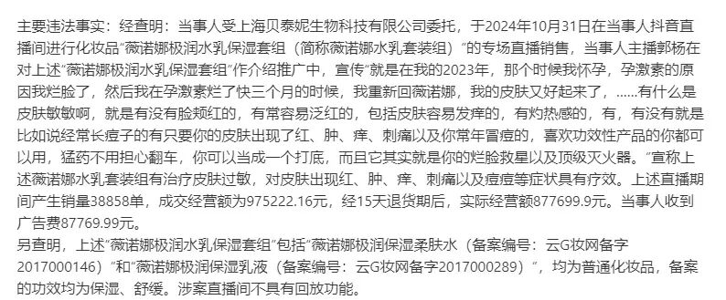 2023年10月,她就因类似问题,因宣传产品具备“提亮肤色”等未备案功效,被罚款1.2万元。