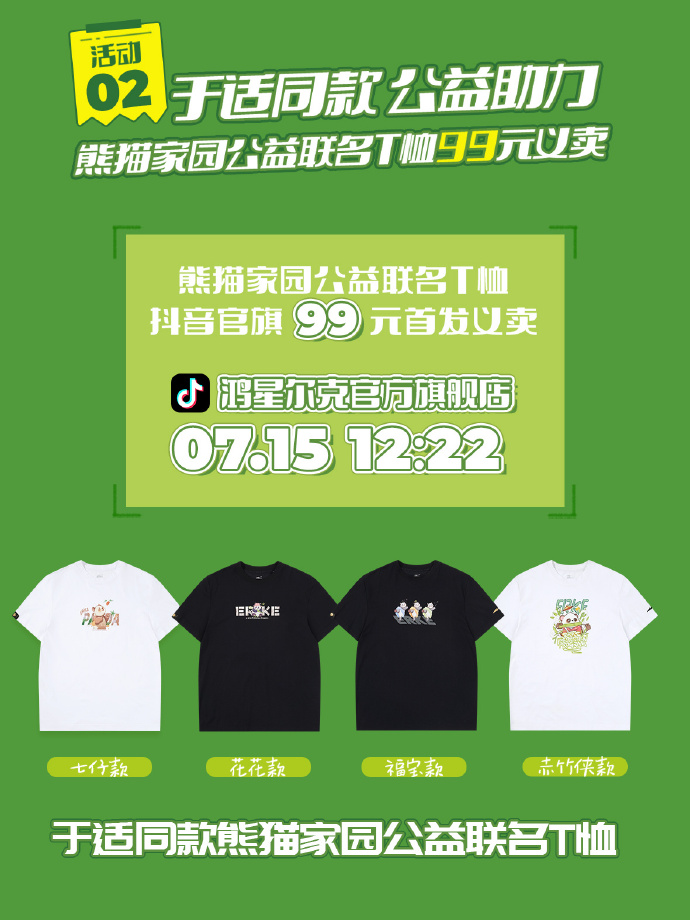 由成都市人民政府举办“熊猫家园·大熊猫文创大赛”,鸿星尔克作为大赛独家合作伙伴,面向世界邀请全球热爱熊猫的优秀青年设计师,创作独具创意的可持续生态作品,将优秀作品融入服装设计,共绘东方时尚,以创意守护熊猫家园,让文化赋能可持续未来。