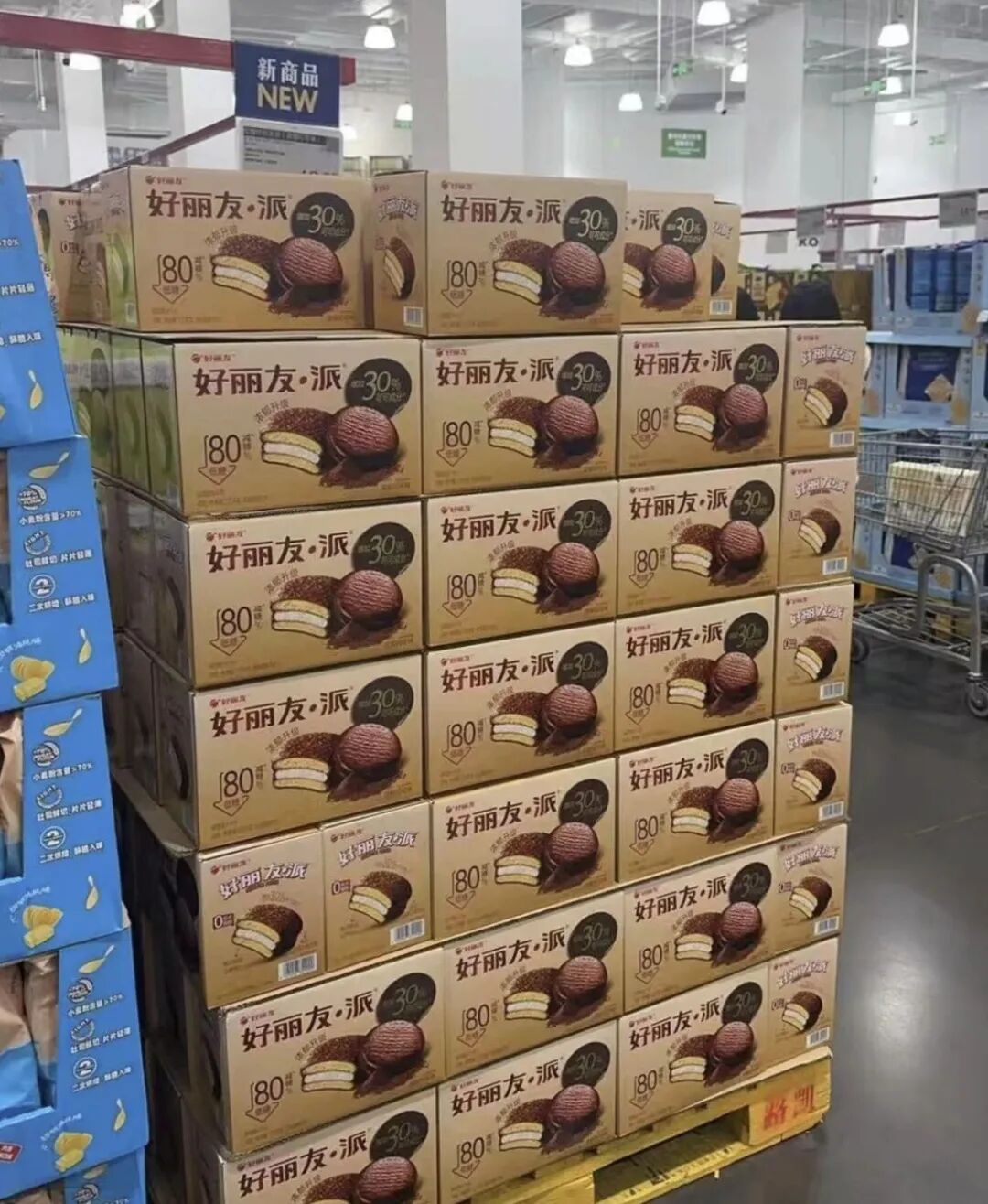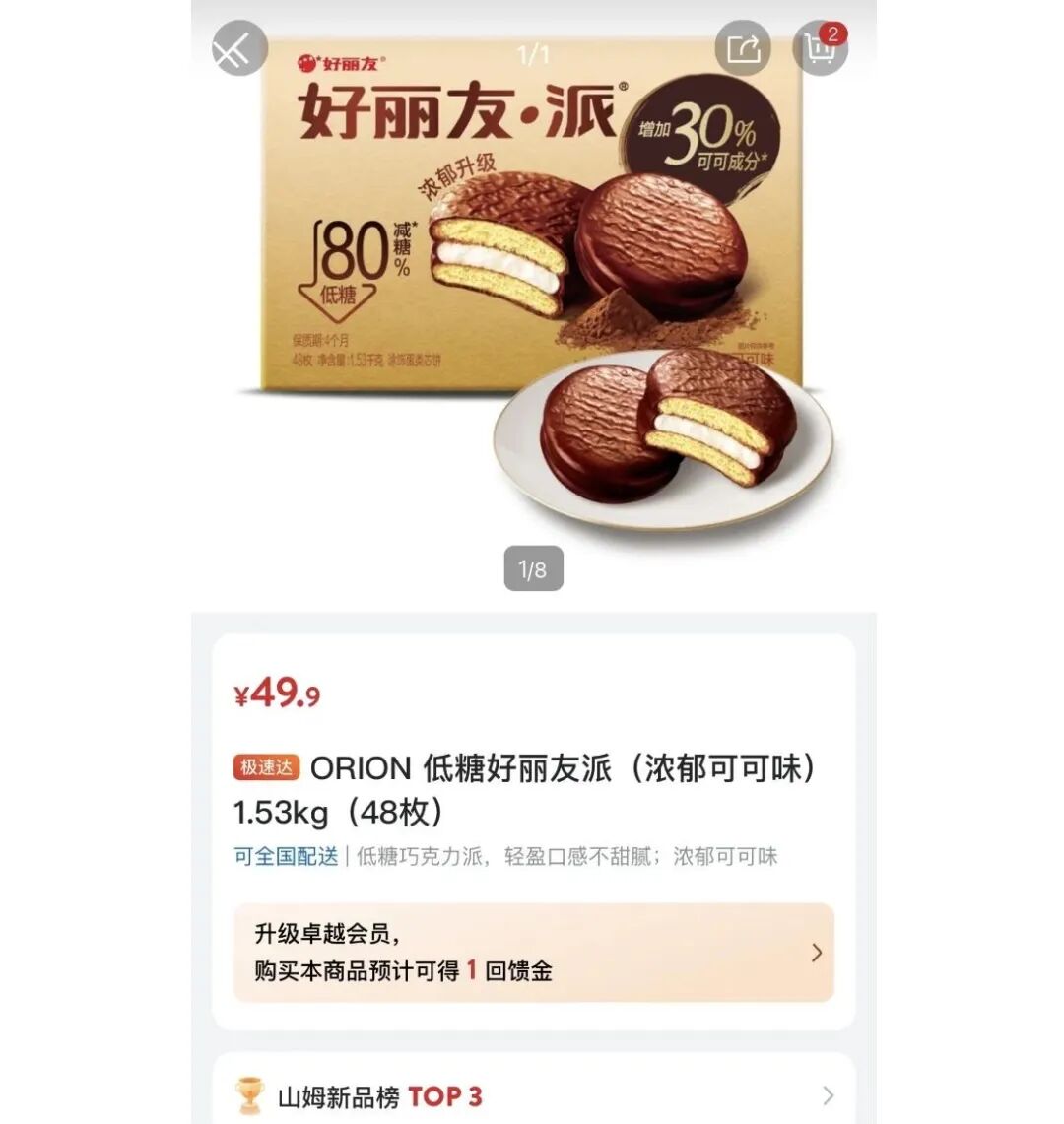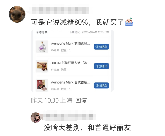更讽刺的是,山姆最近上新的单品“低糖好丽友派”,号称减糖80%。