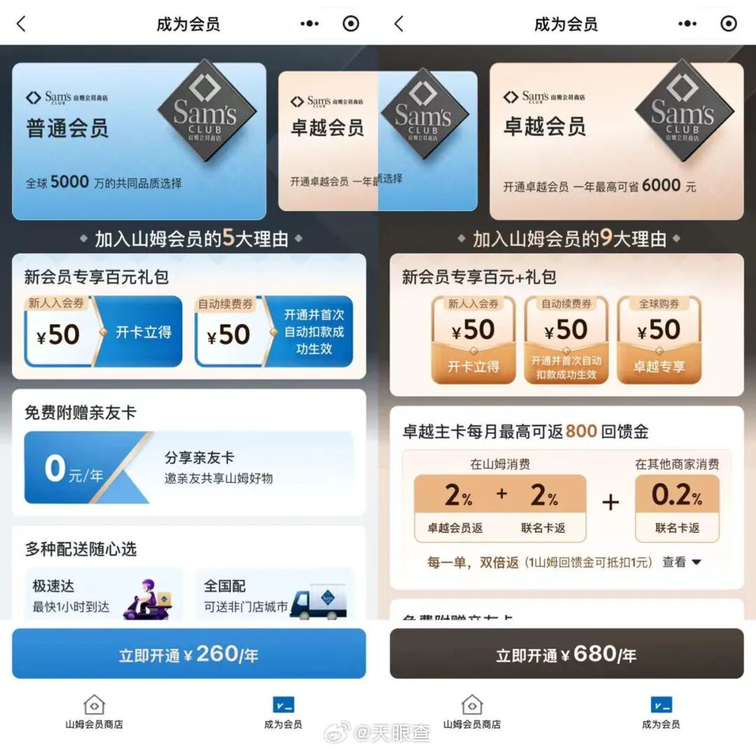 山姆的会员分为两种,260元/年的普通会员,680元/年的卓越会员。卓越会员在普通会员的基础上还可享受积分兑现等特权,会员均实行专人专卡制度。