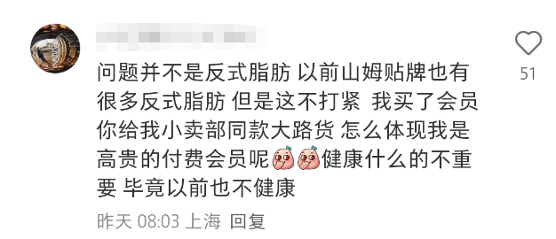 低糖配方本应契合山姆会员店一贯倡导的健康理念,也符合其目标客群中产对品质生活的追求。