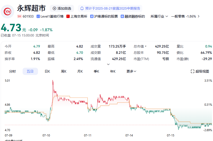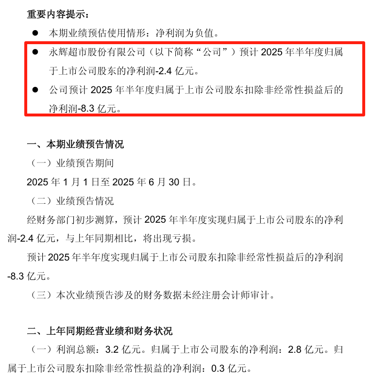 7月15日,永辉超市发布2025年上半年业绩预亏公告,称预计归属于上市公司股东的净利润为-2.4亿元,扣除非经常性损益后的净利润更是达-8.3亿元。