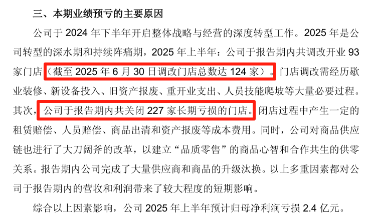 一是门店大规模调改与关闭。仅上半年,公司就调整改造了93家门店,累计调改门店达到124家,同时关闭了227家长期亏损门店。