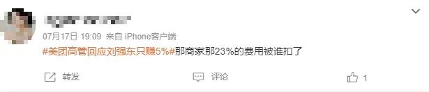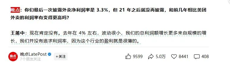 末了,王莆中还不忘阴阳一下此前刘强东的内部讲话爆料:“有些平台之前说他们外卖只想赚5%,大哥,从来没人能在餐饮外卖上能赚到 5%”