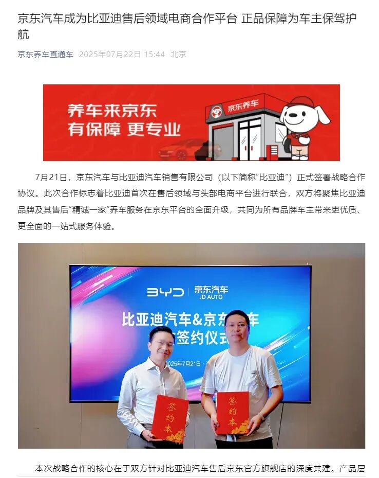 京东宣布,7月21日,京东汽车与比亚迪汽车销售有限公司正式签署战略合作协议,自此成为其在售后领域的电商合作平台。