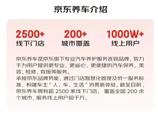 其汽车后市场的品牌“京东养车”,目前已在全国落地超过2500家门店,覆盖全国200余个城市,正逐步构建起完整的服务网络。