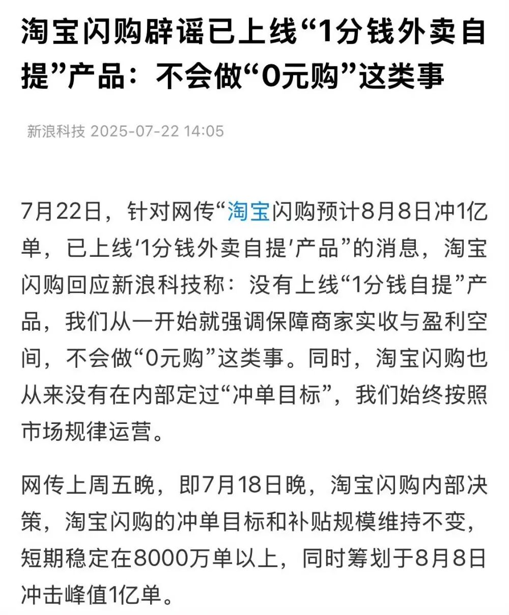 而就在四天后的7月22日,针对网传“饿了么联合淘宝闪购预计8月8日冲1亿单”的消息,淘宝闪购更是严肃回应称: