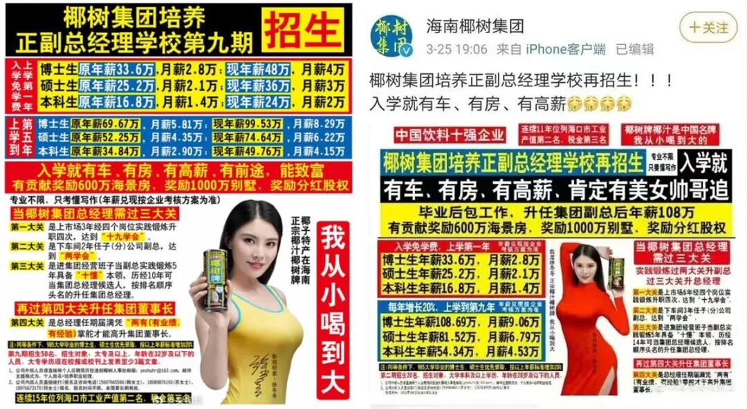 要知道,椰树曾因招聘广告中“入职就有车、有房、有高薪,肯定有美女帅哥追”的内容违背社会良好风尚,被海南省市场监督管理局罚款 40 万元。