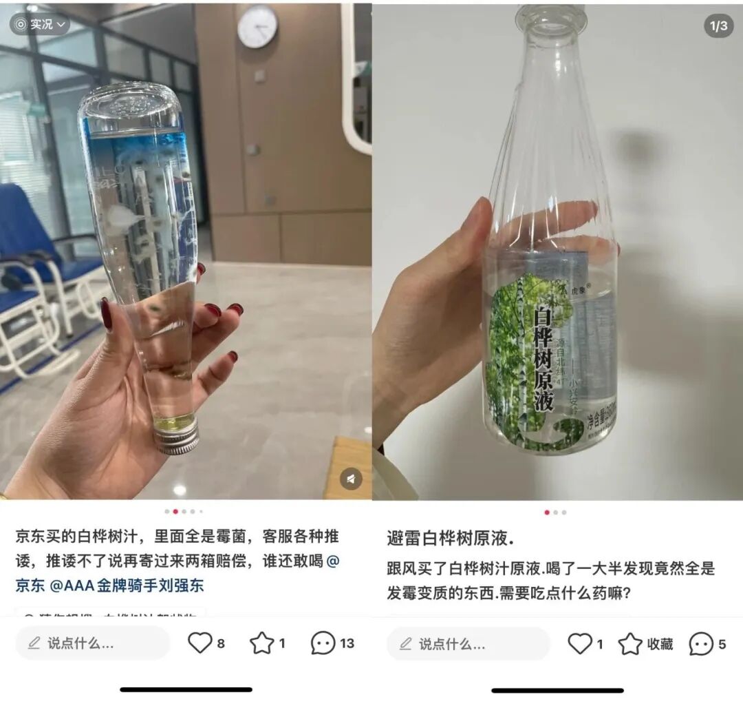社交平台上,可以看到买到乃至喝到发霉产品的消费者不在少数,甚至来自不同的品牌,可见很多企业连起码的杀菌都没有做到位。
