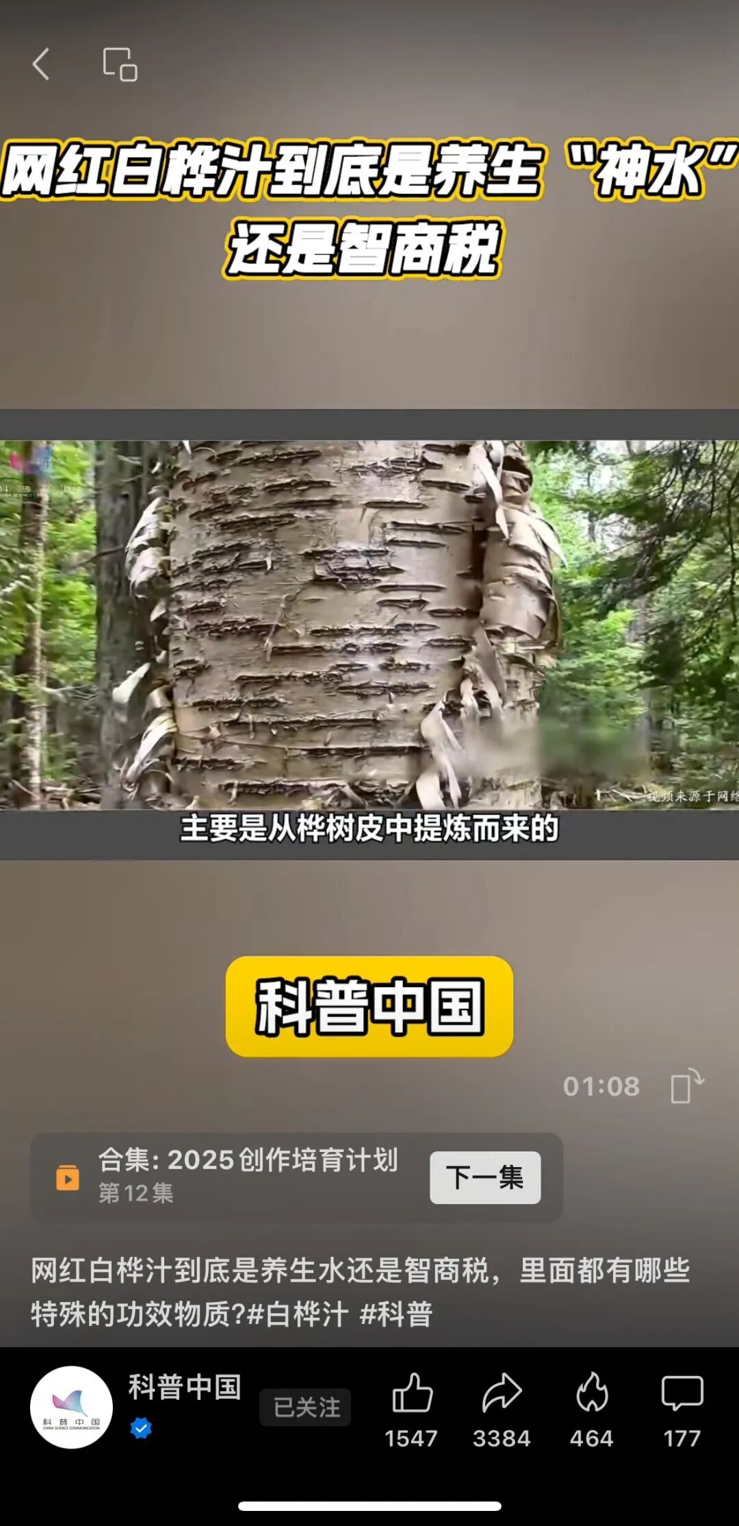 至于那些被热炒的“白桦三萜类活性物质”,如白桦脂醇和白桦脂酸,《科普中国》也专门提到过,这些物质主要来源于桦树皮,在白桦树汁中含量极少,微量摄入根本无法达到预期的健康效果。