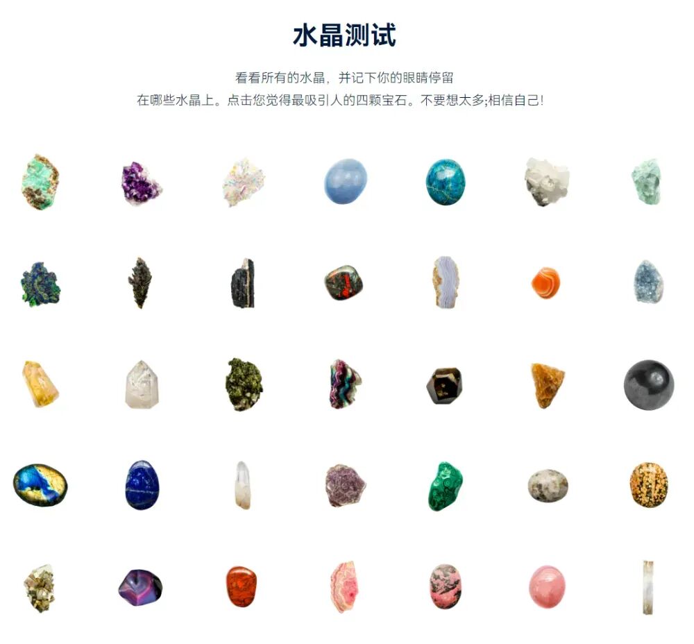 不仅如此,品牌官网还专门设有测试页面,根据个人能量推荐对应水晶——黑碧玺消除负面能量,粉晶吸引爱情,紫水晶疏解焦虑……