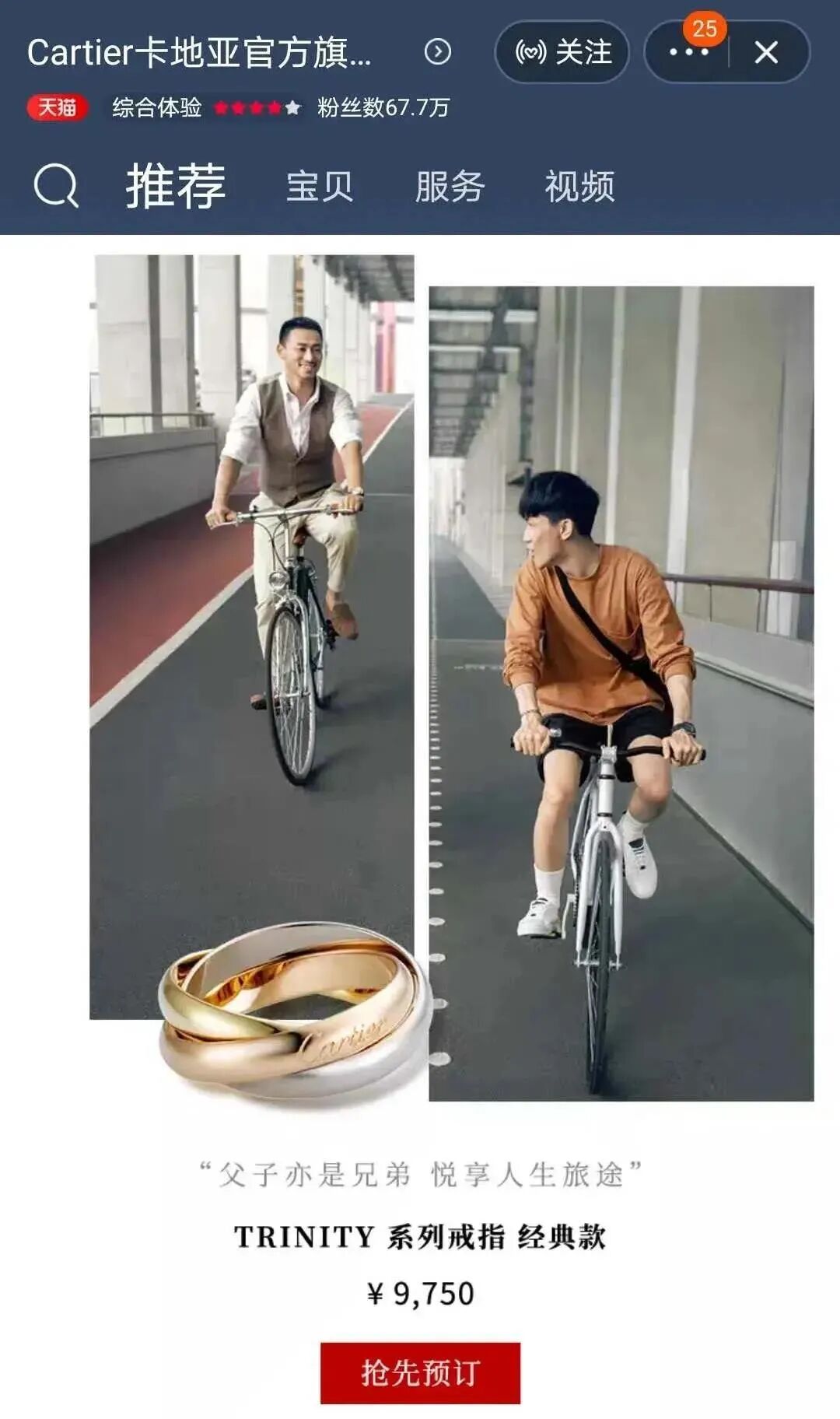 卡地亚在天猫旗舰店的首页将这对看起来关系亲密的男子描述为父子,并配文“父子亦是兄弟,悦享人生旅途”,但为了蹭七夕节的热度,商品预售订金是520,产品的礼盒,也是专门的“七夕”礼盒。