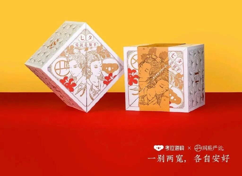 不仅如此,考拉海购和网易严选还共同推出了「爱就是放手」礼盒,这个礼盒还有另外诗意的名字——「一别两宽,各自安好」,配上创意十足的设计,封贴部分可以用剪刀沿着虚线剪开,表达「剪短愁绪」的寓意。