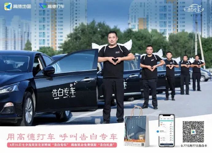 同时,高德还在“告白专车”上为乘客准备了「七夕文案」,助力大家勇敢追爱,并同步在官方微博发布了一组主题海报。