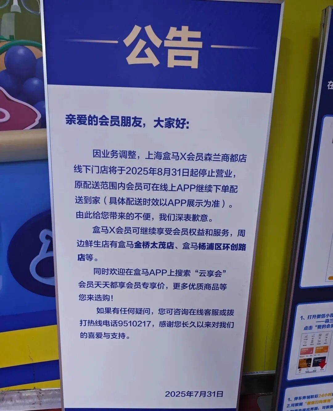 7月31日,盒马X会员店北京世界之花店、苏州相城店、南京燕子矶店已同步停止营业。