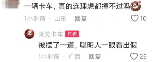 面对网友真真假假的质疑,乘龙卡车犀利的回应道:“被摆了一道,聪明人一眼看出假!”并表示法务部门已经开始处理。