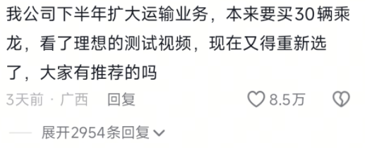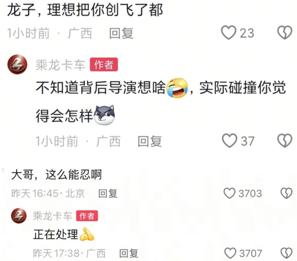 有人调侃“牛顿的棺材板快按不住了”,有人跑去乘龙卡车的抖音评论区假装退订,更有卡车司机留言求助:"现在路上见了理想就发抖,在线等解决方案"。