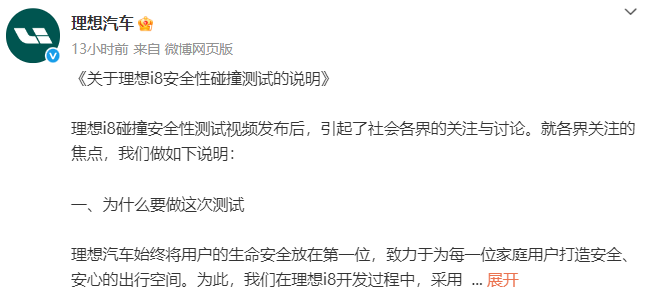 理想强调,中国汽研为国资背景权威机构,测试数据具有公信力,视频中展示的i8表现为“无柱体变形、气囊全开、门把手自动弹出、电池无漏液”。