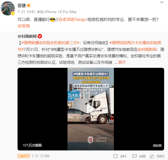 更戏剧性的是理想高管竟然隔空喊话乘龙:“相信权威机构的专业,要不来复测一把?”将公关危机推向新一轮高潮。