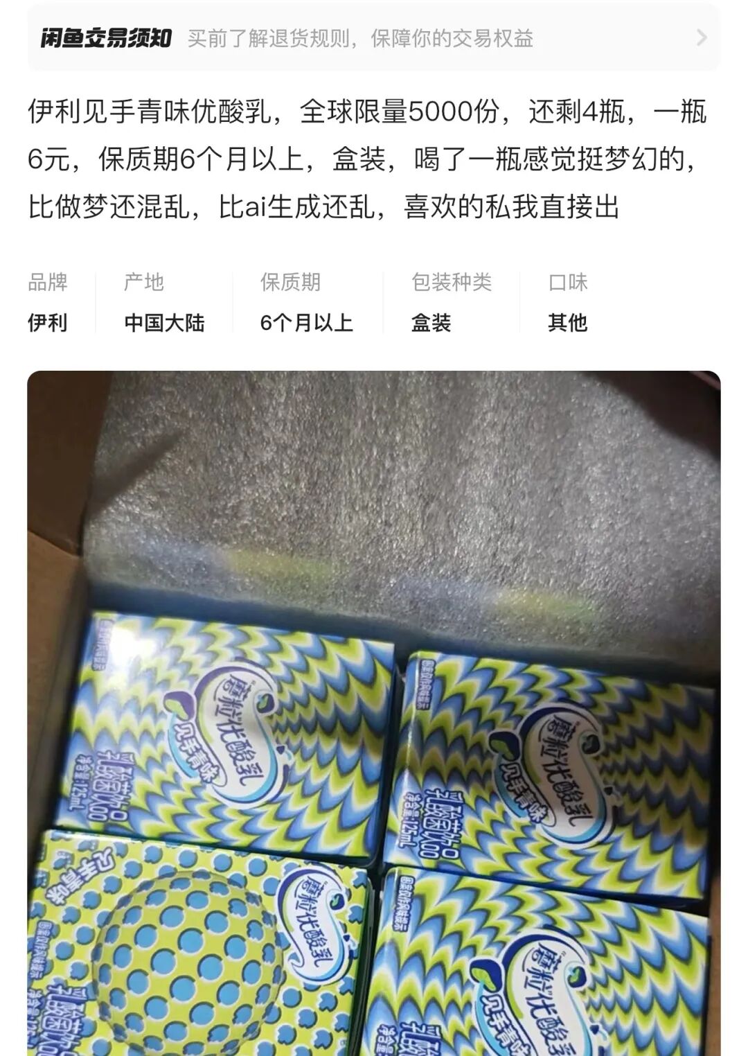 甚至有闲鱼卖家挂出商品并描述:“优酸乳见手青限定款,全球仅 5000 箱,余 4 瓶”,单瓶标价 6 元。