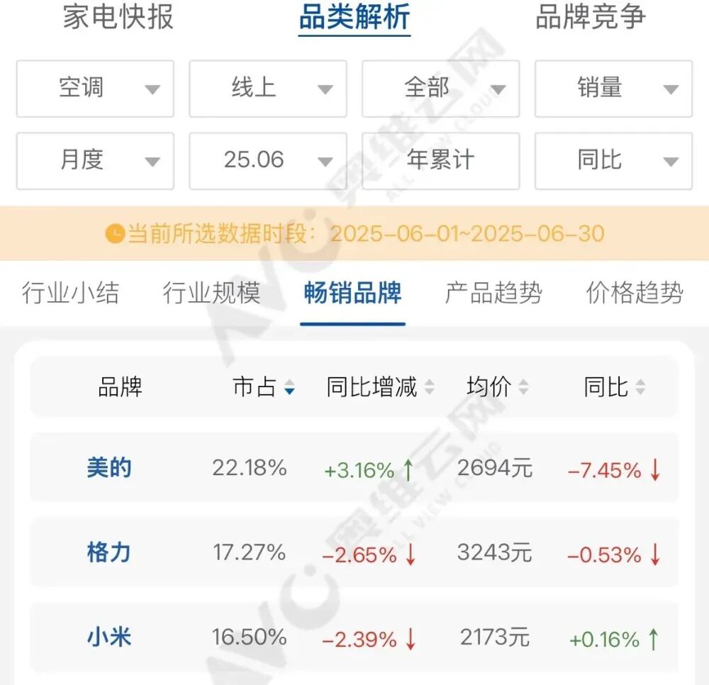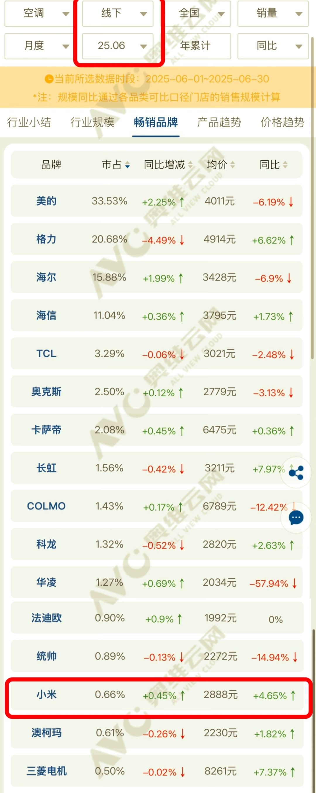 根据奥维云网数据,截至2025年6月,小米空调在线下的市场份额仅为0.66%;