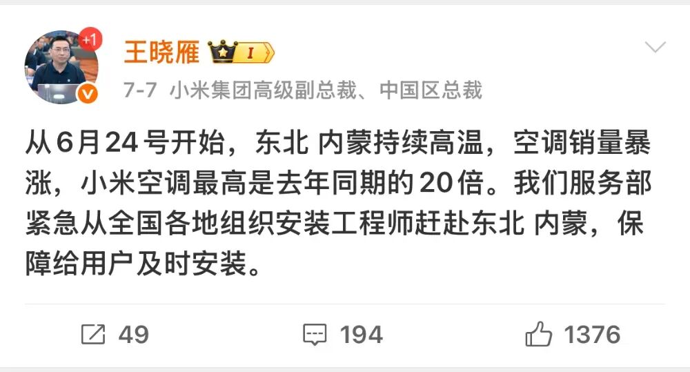 由于东北内蒙地区的持续高温,小米空调销量暴涨,一度达到去年同期的20倍。