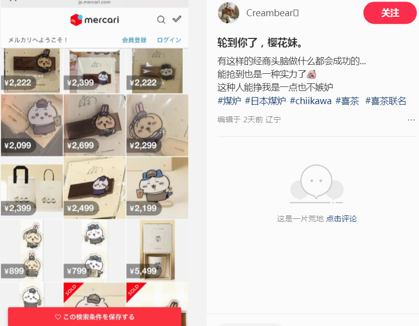 由于 Chiikawa在日本本土拥有极高人气,但喜茶并未在日本发售联名产品,导致日本粉丝只能通过二手渠道高价购买。