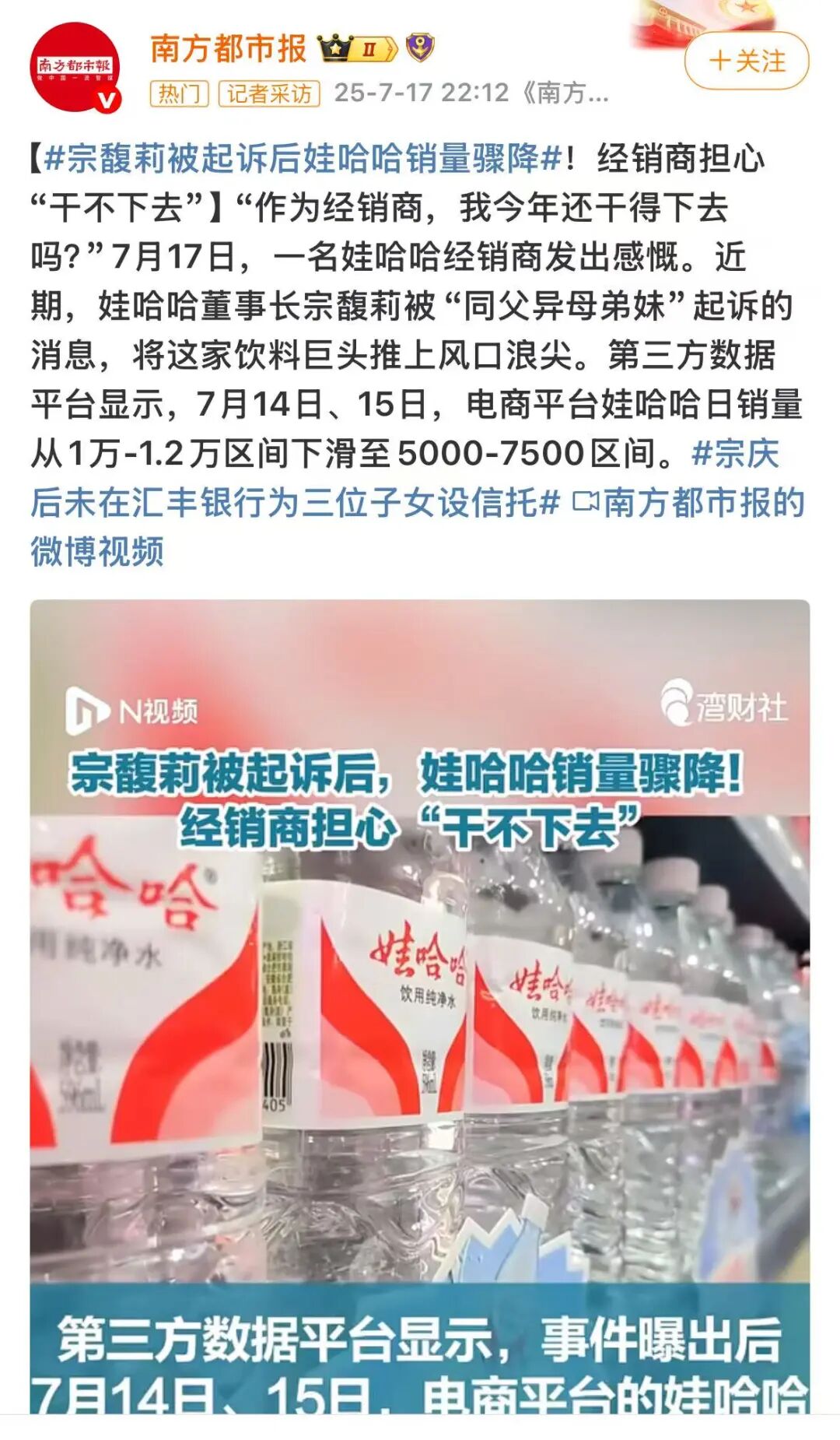 第三方数据平台显示,事件曝出后,娃哈哈在电商平台的日销量从1万-1.2万区间骤降至5000-7500区间;