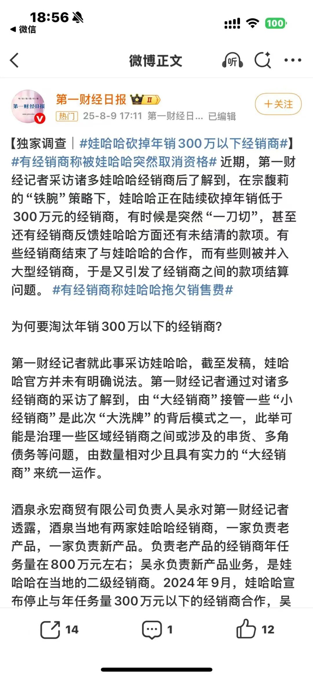就在近日,第一财经报道称,在宗馥莉的“铁腕”策略下,娃哈哈正在陆续砍掉能力不足的经销商。