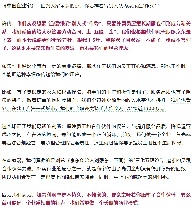 此前,很多分析声音指出京东给全职骑手上五险一金,是道德绑架,或说是“作秀”