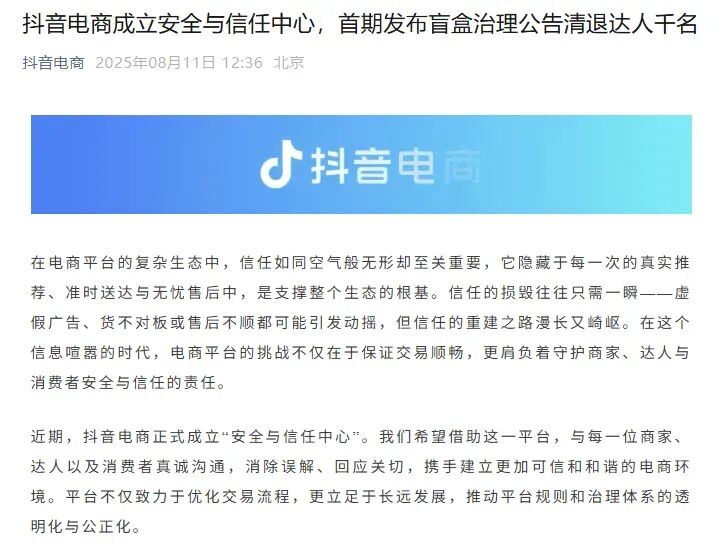具体而言,8月8日,抖音电商正式成立“安全与信任中心”,发布首期治理公告,重点打击盲盒营销违规。