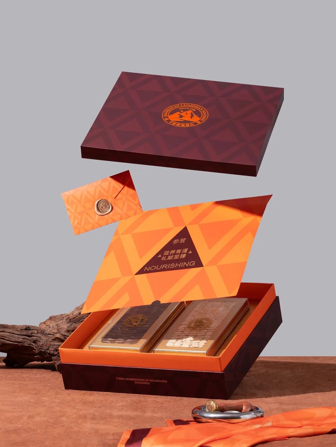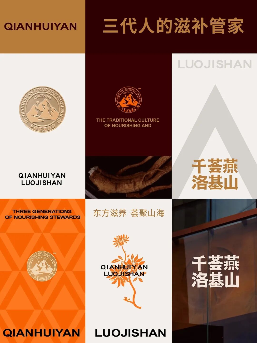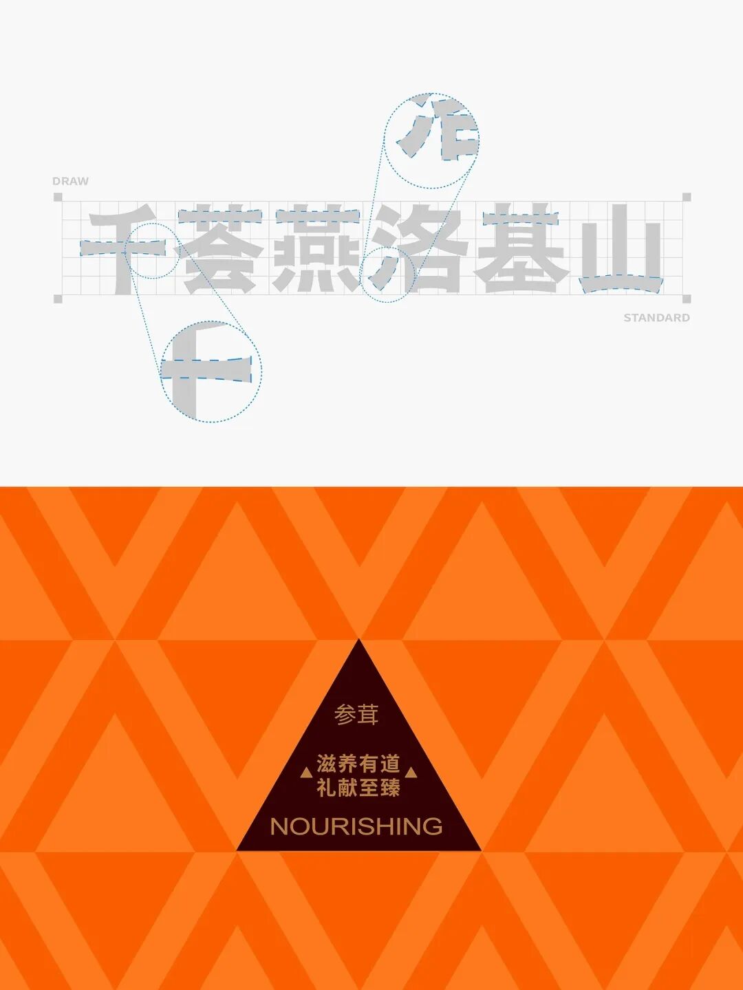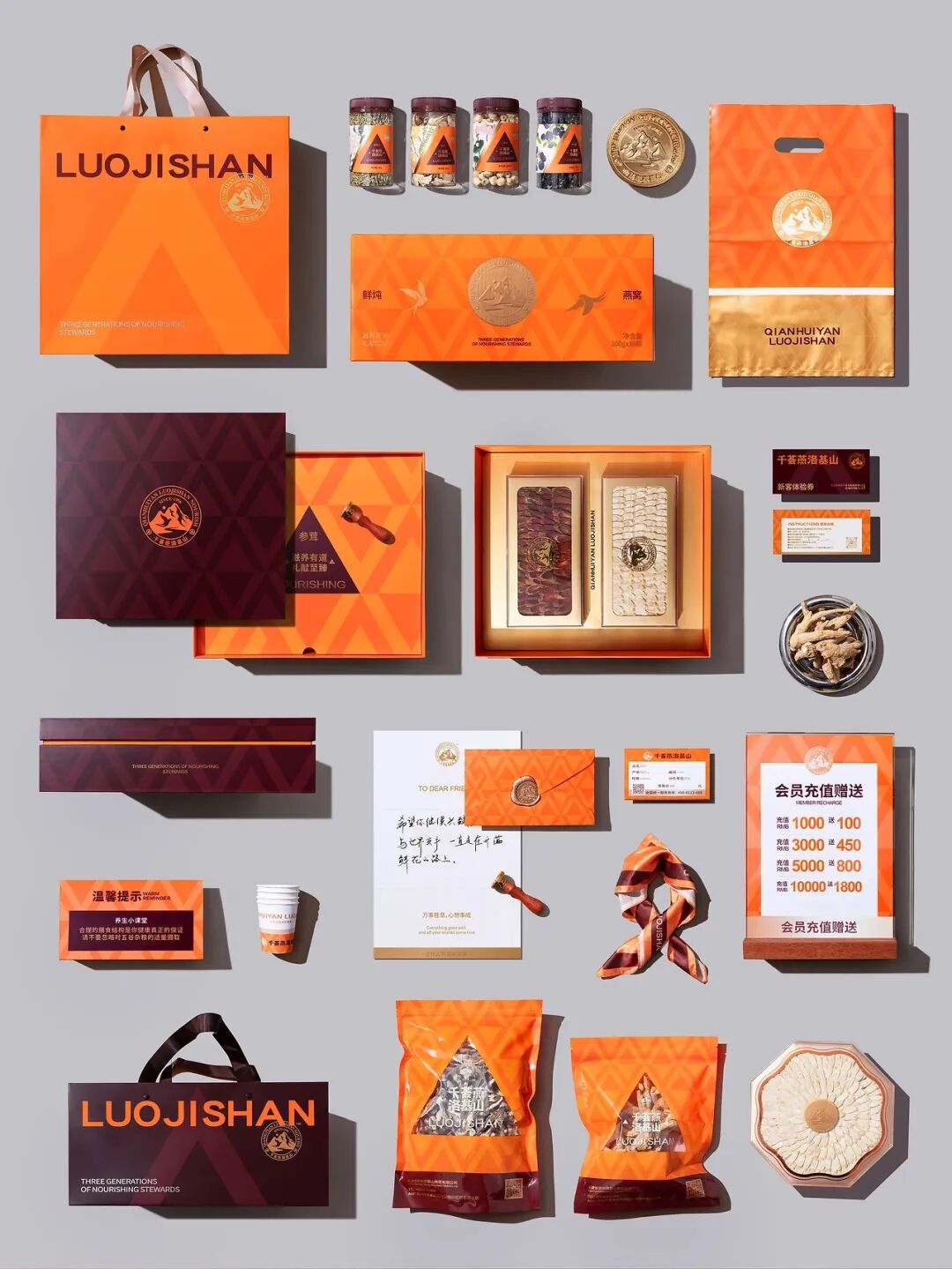 在视觉重塑上,保留原logo中最具辨识度的“山脉”元素,并以此构建极具识别性的“三角”超级符号以及延展性极强的品牌超级底纹;色彩方面,选用橙咖搭配作为品牌核心色彩组合,呼应全新视觉中的轻奢定位,不仅传递活力与时尚感,契合中青年审美,也延续了滋补品经典的贵重基调。