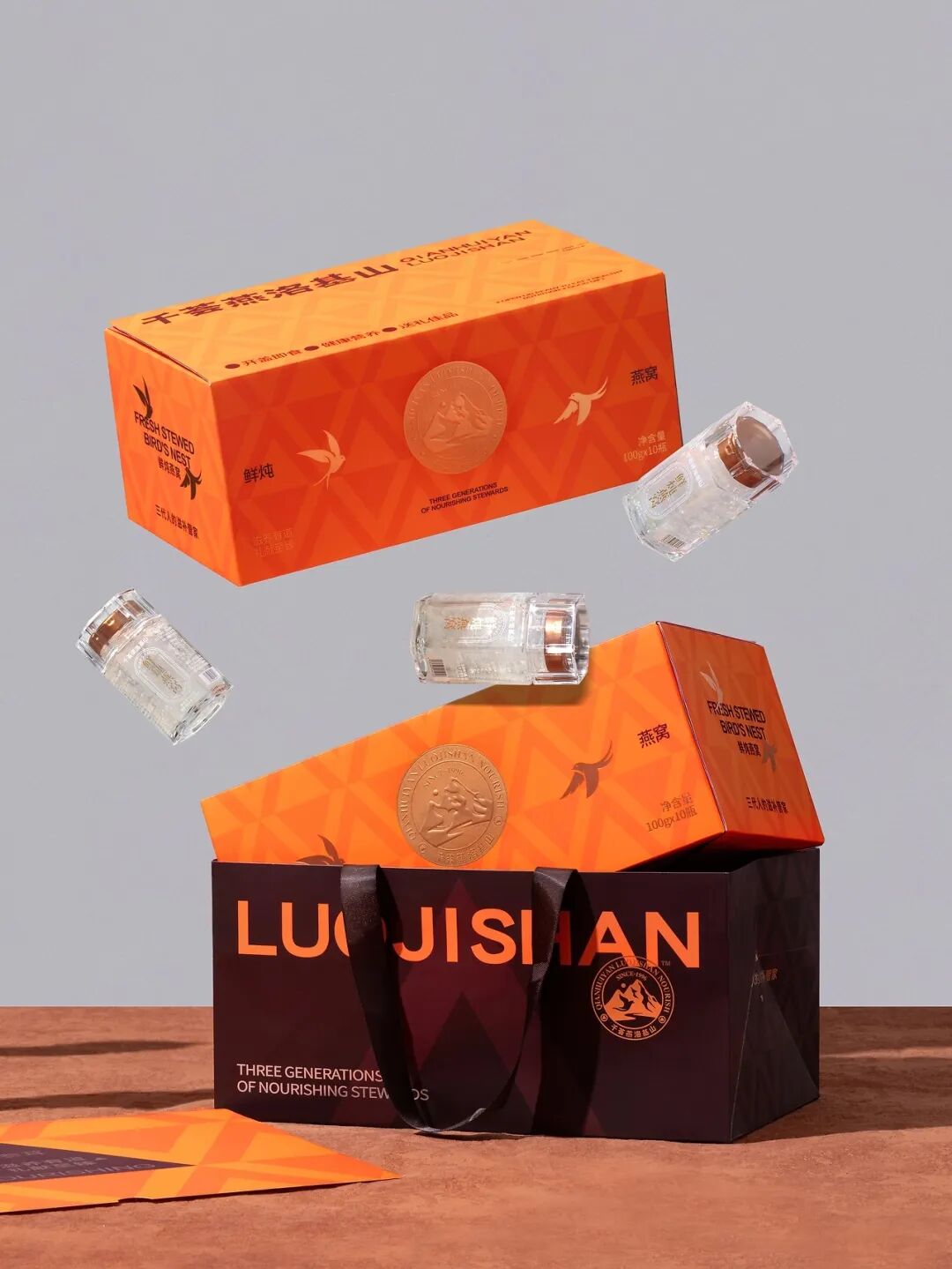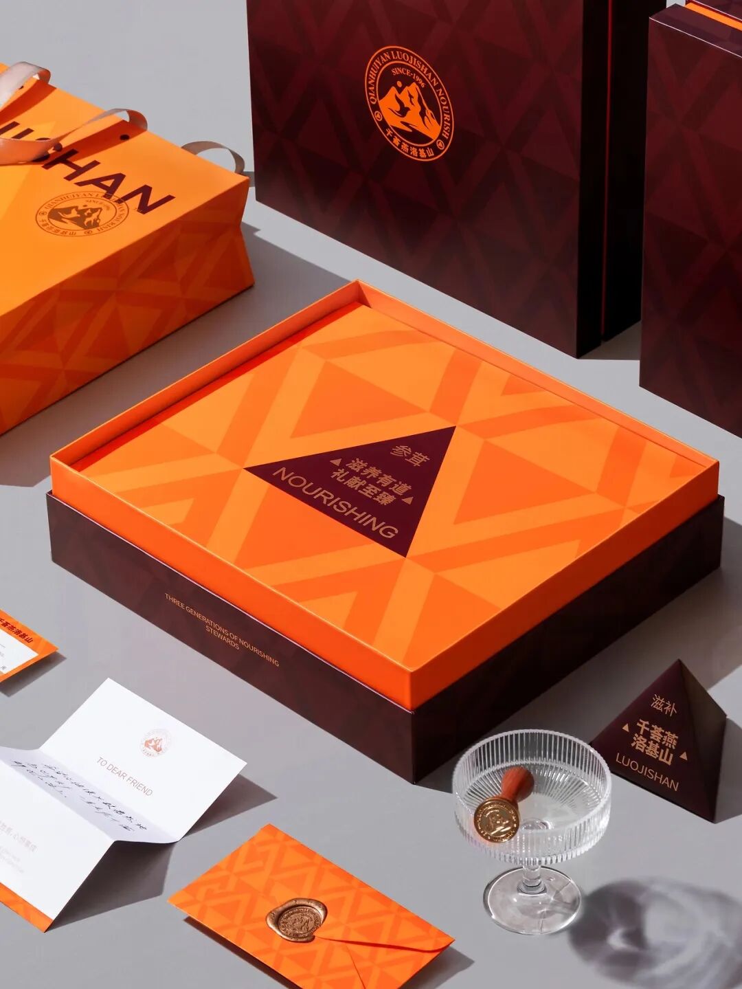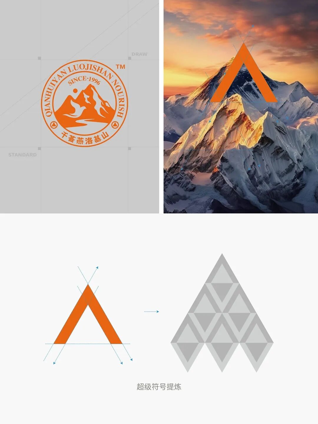 在视觉重塑上,保留原logo中最具辨识度的“山脉”元素,并以此构建极具识别性的“三角”超级符号以及延展性极强的品牌超级底纹;色彩方面,选用橙咖搭配作为品牌核心色彩组合,呼应全新视觉中的轻奢定位,不仅传递活力与时尚感,契合中青年审美,也延续了滋补品经典的贵重基调。