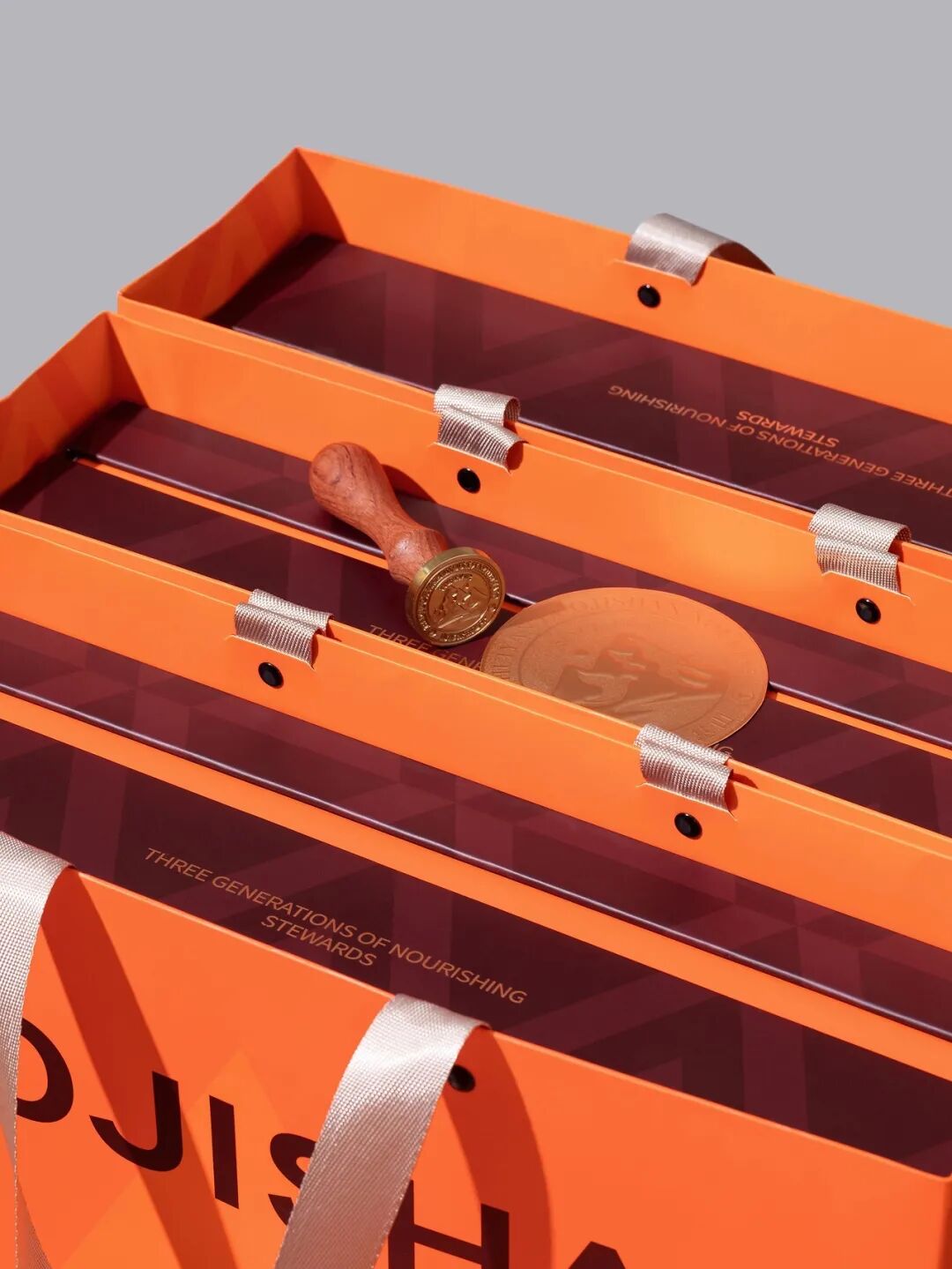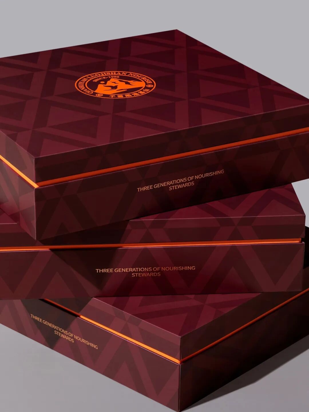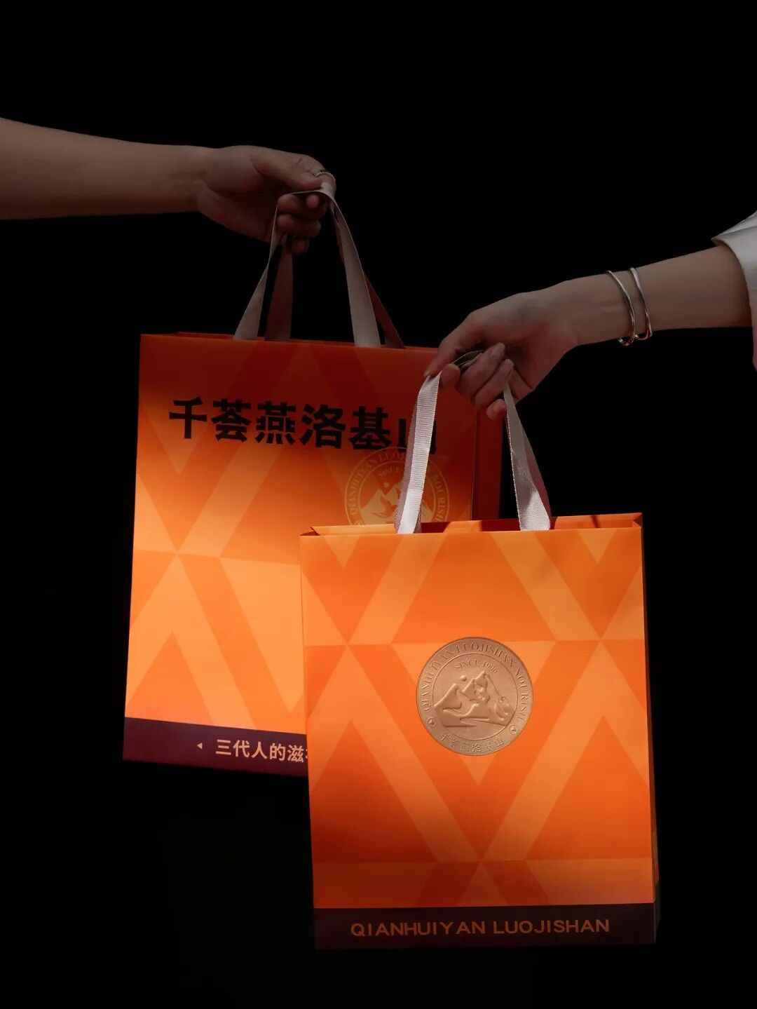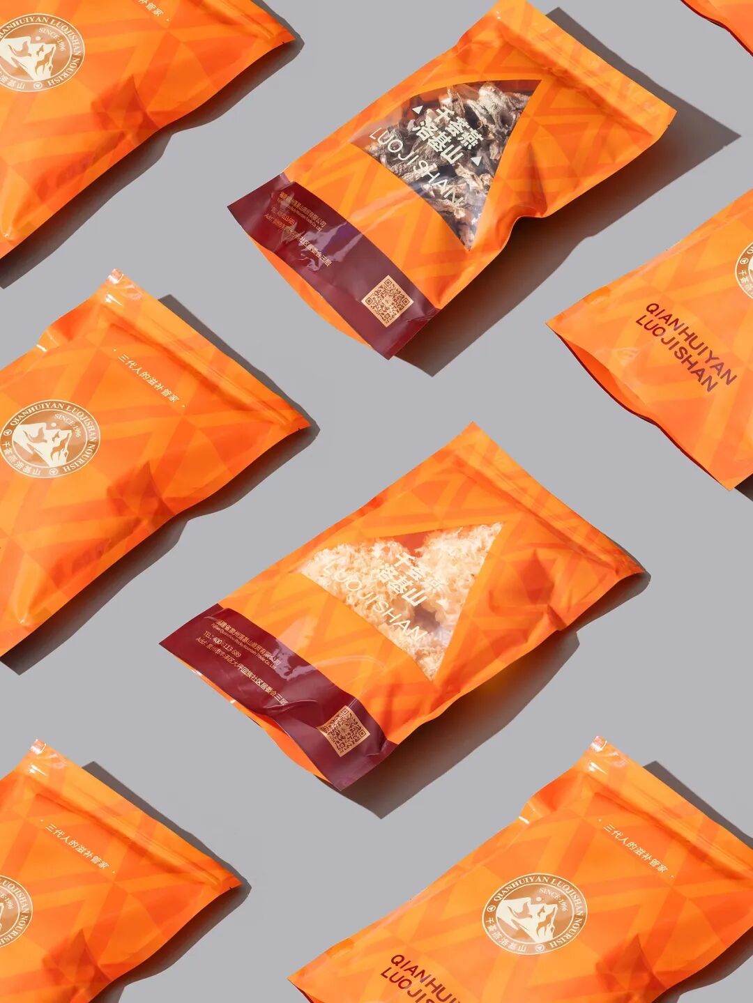 在视觉重塑上,保留原logo中最具辨识度的“山脉”元素,并以此构建极具识别性的“三角”超级符号以及延展性极强的品牌超级底纹;色彩方面,选用橙咖搭配作为品牌核心色彩组合,呼应全新视觉中的轻奢定位,不仅传递活力与时尚感,契合中青年审美,也延续了滋补品经典的贵重基调。