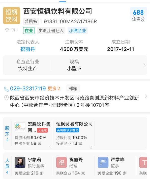 企查查信息显示,西安恒枫饮料有限公司投资主体并非娃哈哈集团,而是宗馥莉个人控股100%的宏胜饮料集团有限公司。宗馥莉担任执行董事,是实际受益所有人。