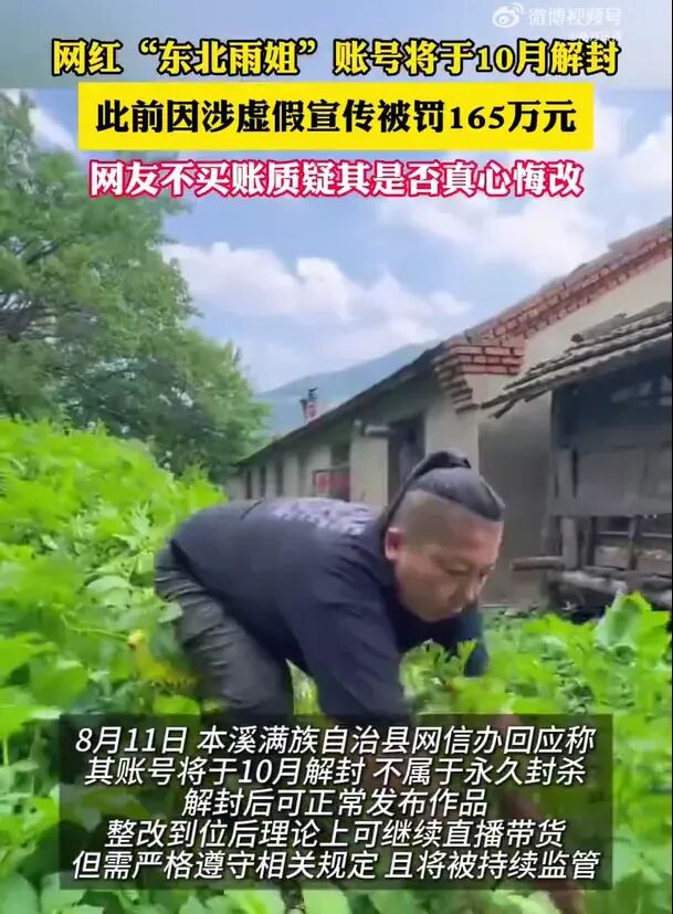 本溪满族自治县互联网信息办公室工作人员证实,东北雨姐的抖音账号将于今年10月解封,整改到位后理论上可继续带货,同时强调必须遵守相关规定,不得虚假宣传、涉黄、涉毒涉赌,并接受持续监管。