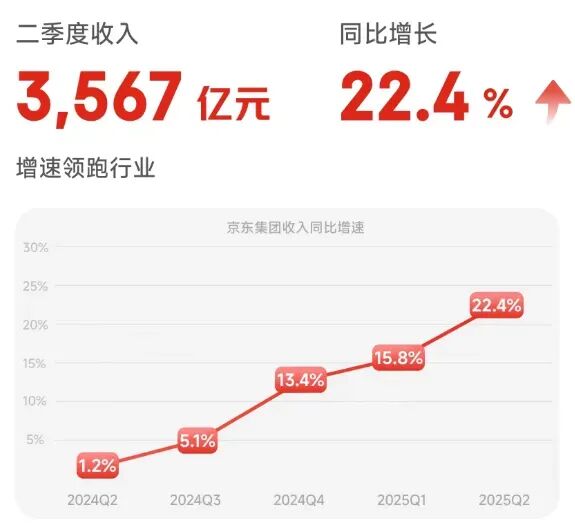 8月14日,京东集团发布了2025年二季度财报,营收3567亿元,同比增长22.4%,刷新近三年收入增速新纪录。