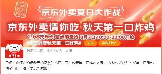 在“秋天的第一杯奶茶”补贴大战热火朝天时,京东选择不跟风,反而推出“秋天第一口炸鸡”,并调侃“谁还在惦记秋天的奶茶?格局打开!秋天第一口炸鸡才是真·入秋仪式感!”