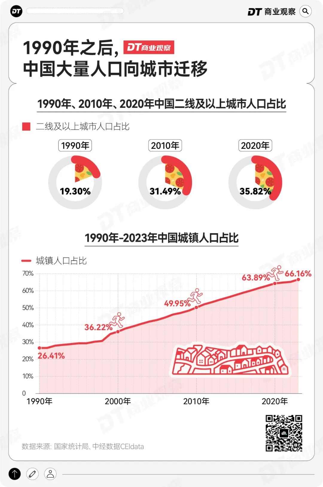 1990年,中国城镇人口占比只有26.41%,2010年,已经接近50%,20年间中国城镇人口大概增长了3.6亿。大量的人口涌向大城市,到2010年,全国有近1/3的人口都在一线、新一线和二线城市。
