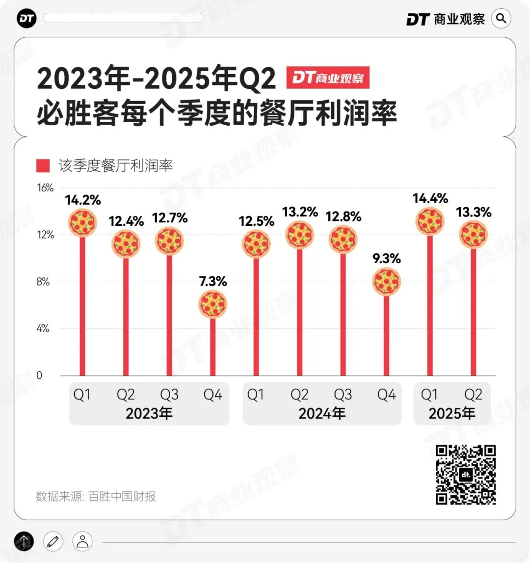 2024年开始,必胜客WOW门店模式为消费者提供了更具有性价比的选择,但2024年Q2开始,每个季度餐厅利润率都在同比增长,2025年Q1达到了14.4%,Q2达到了13.3%。