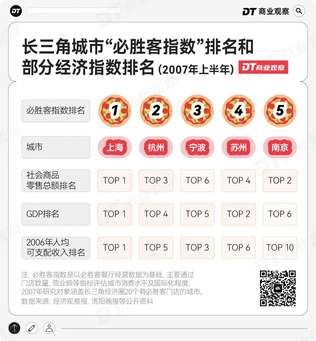 当年,一个有意思的说法叫“必胜客指数”。简单来说,是把必胜客的经营数据(门店数量、门店销售额等)折合为指数,指数越高,意味着这座城市的发展等级、消费力、城市活力就越高。