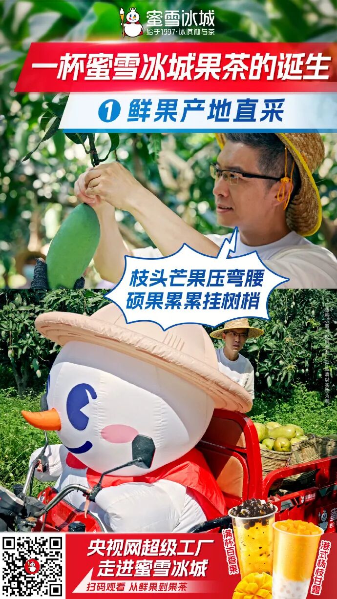 8 月10日,在两大主持人朱广权和常婷的带队下,央视《超级工厂》走进蜜雪冰城,以“真看、真探、真体验”的方式,探访了雪王的芒果采摘基地,以及大咖国际广西、海南工厂。
