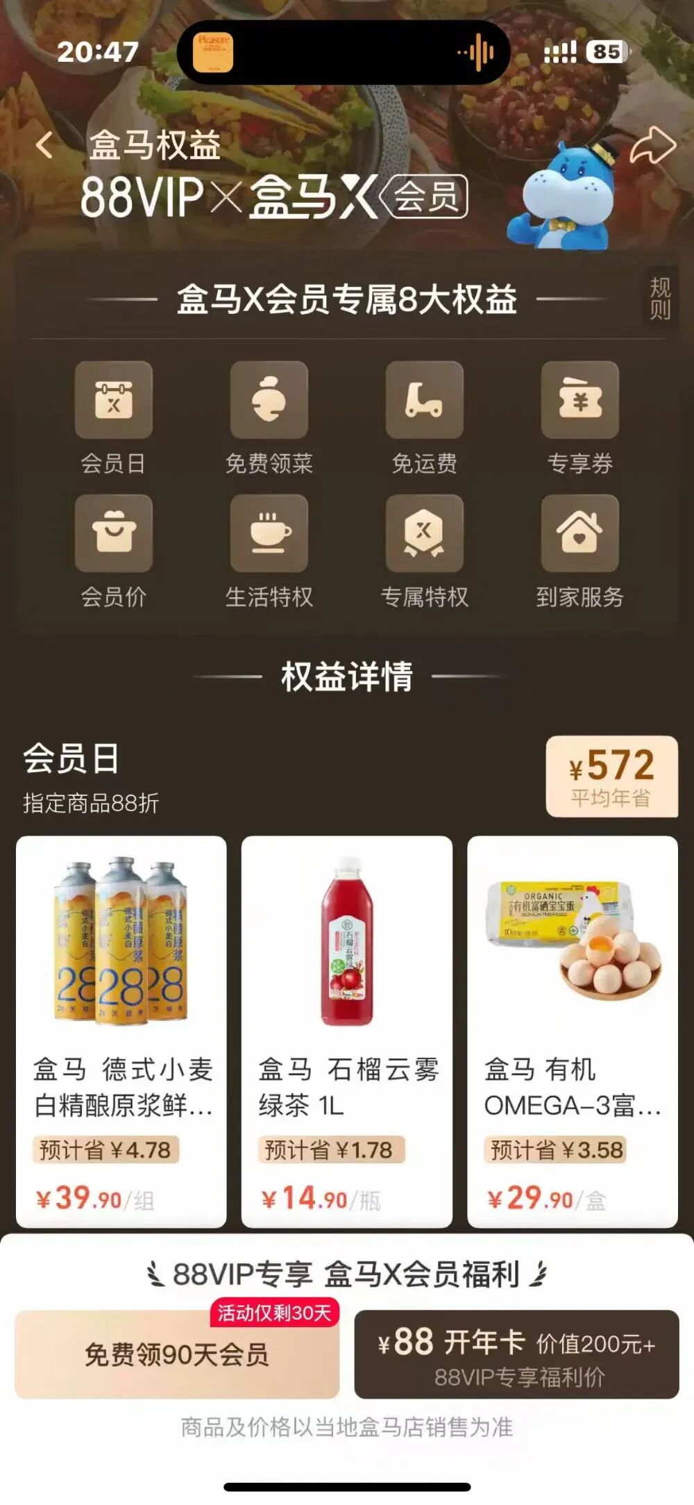 除了在原有的权益基础上加码饿了么、飞猪、高德地图等会员权益,还为88VIP用户赠送了为期90天的盒马X会员体验卡。