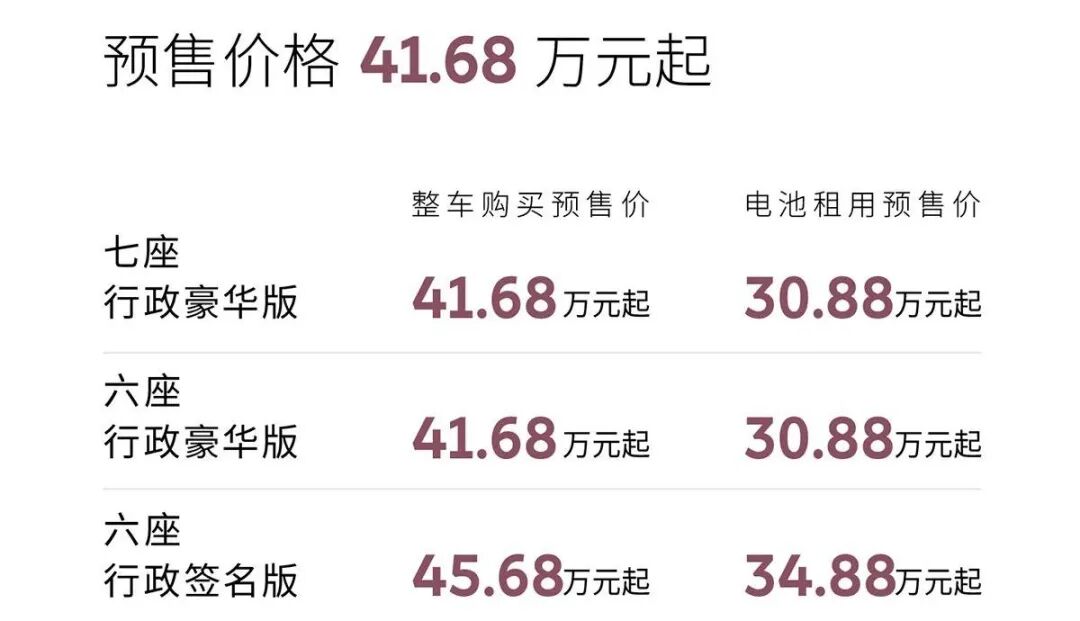 当六/七座行政豪华版预售价来到41.68万元、租电价格更是低至30.88万元时,李斌封神了。