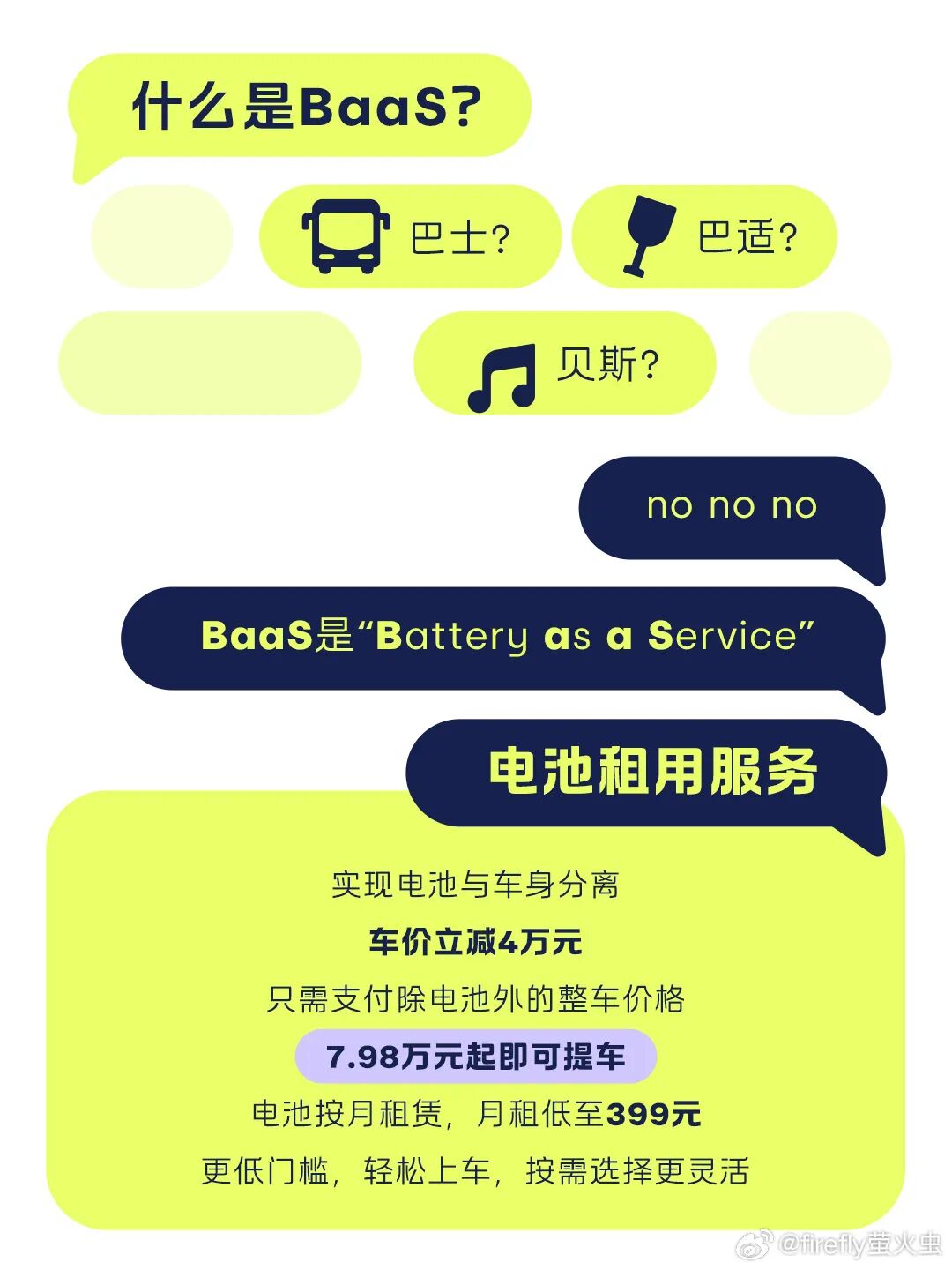 而第三品牌萤火虫也不赖,BaaS租电方案起售价7.98万元,每月租金399元还能“付四赠一”,5月销量就超过了Mini EV和Smart之和。