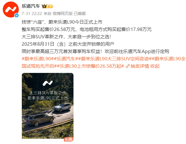 7月底上市的乐道L90,价格在预售27.99万的基础上再降1.4万,BaaS方案更是低至17.98万元。