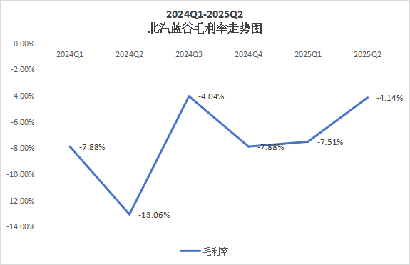 2025年上半年,北汽蓝谷实现营收95.16亿元人民币,同比增长达到154.38%;然而增收却不增利,上半年毛利率为-5.3%,归属上市公司股东净亏损则为23亿元,相比去年同期有小幅收窄。