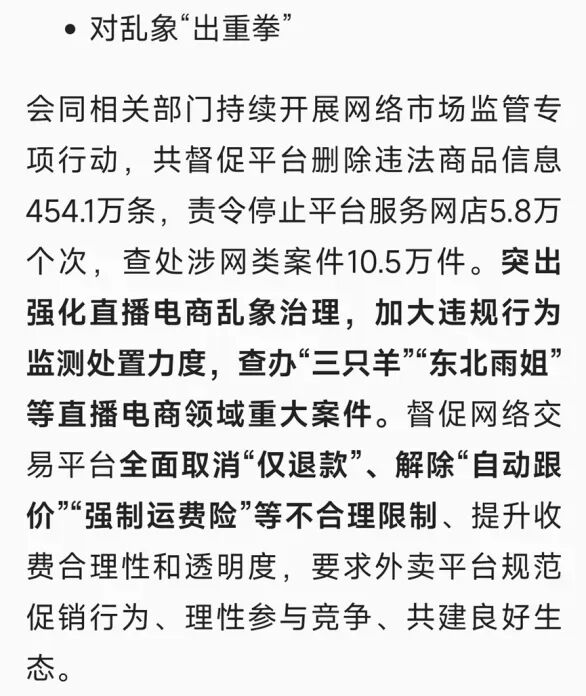 此外,市监总局还突出强化了直播电商乱象治理,加大违规行为监测处置力度,查办“三只羊、东北雨姐等直播电商领域重大案件”。