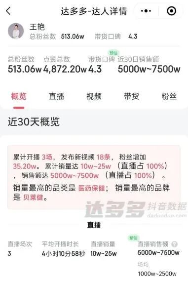 据达多多数据平台统计,王艳近三场直播的累计销售额大约为5000万-7500万。