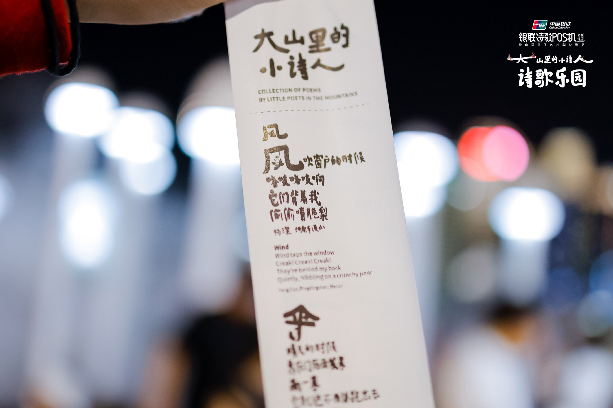 这是用山野灵气和山间孩子想象力组合成的“东方乐园”,银联诗歌POS机将散落的诗意集结,带到黄浦江边,变成真是乐园,让“大山”与“大城”相互成就,让诗意被听见,也让善意被看见。
